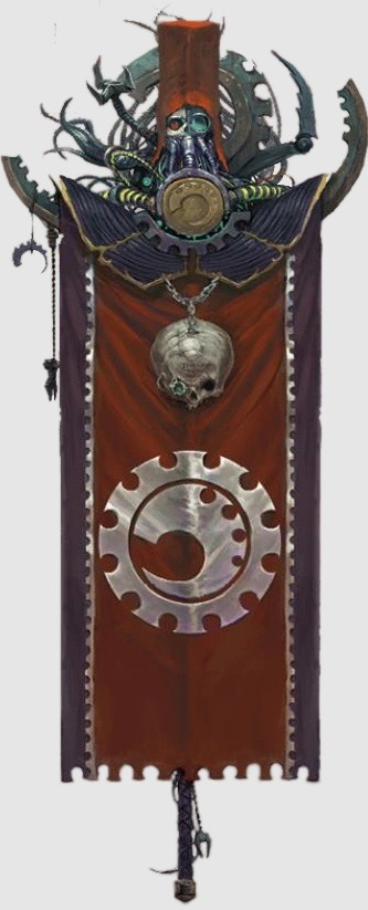 Культисты Зазубренной Шестерни одеты в кроваво-красные одеяния тех миров-кузниц, что тесно связанны с Марсом, Красной Планетой. Их главное боевое знамя натянуто на останки техножреца-доминуса Овидия Тренсиома, чья одержимость необходимостью получения энергии для собственного потребления привела к первому бунту на Фейнминстер Гамма. Эти цвета теперь реют над Цитаделью Промышленности Тренсиома как символ победы над Культом Механикус