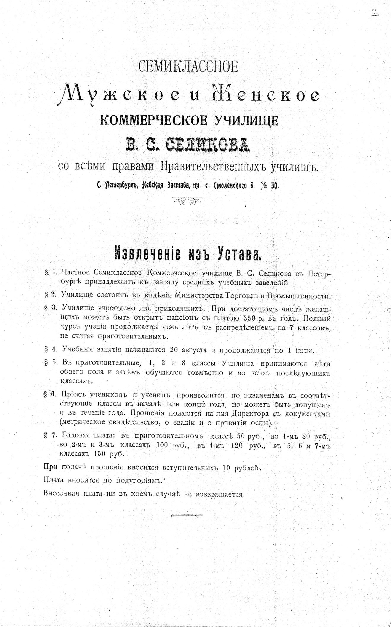 История образовательного учреждения началась ещё до революции. В 1907-ом году на проспекте с. Смоленского, 30 — прежний адрес дома № 54 по пр. Обуховской Обороны — открылось частное Семиклассное Коммерческое училище Селикова [3].