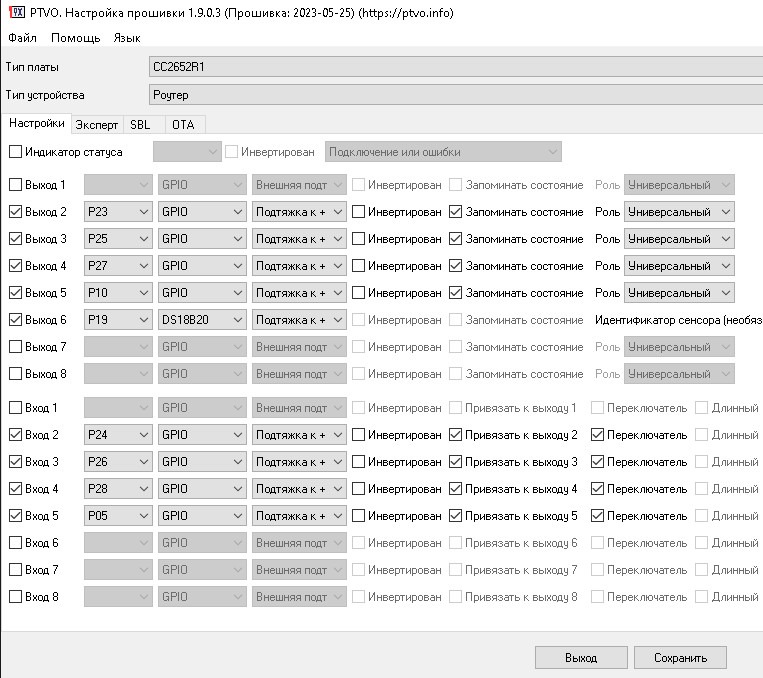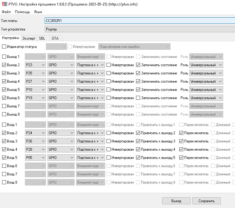 Прошивка для данного реле собрана в конфигураторе PTVO и загрузка производится помощью программатора J-link V11, используя контакты на плате Cjtag
