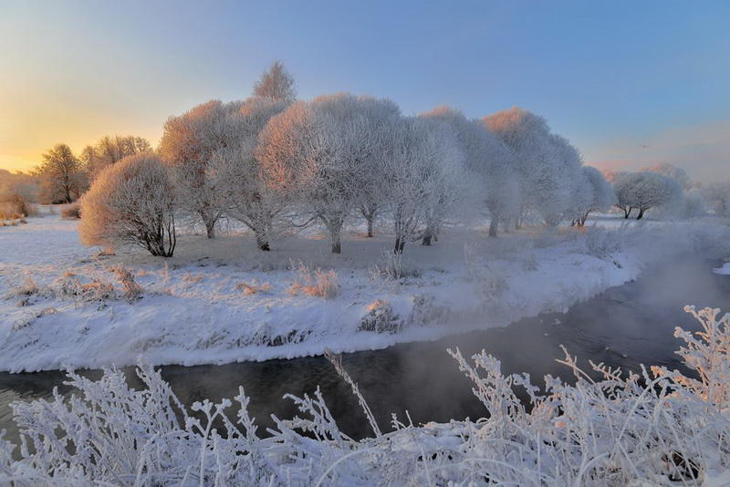 Снежные березы . Автор фото Денис Беляев . Зима в России . Салихард, Сибирь, Ямал, автор снимка Евгений Кужилев . Россия . Зимняя радуга в Москве под Рождество из-за сильных морозов в январе 2017 года .