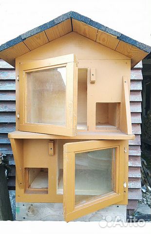 Зимний уличный домик для кошки должен быть оборудован лазом, чтобы кошка могла спокойно туда войти . Некоторые хозяева делают конструкции с окном, но это не обязательный элемент .