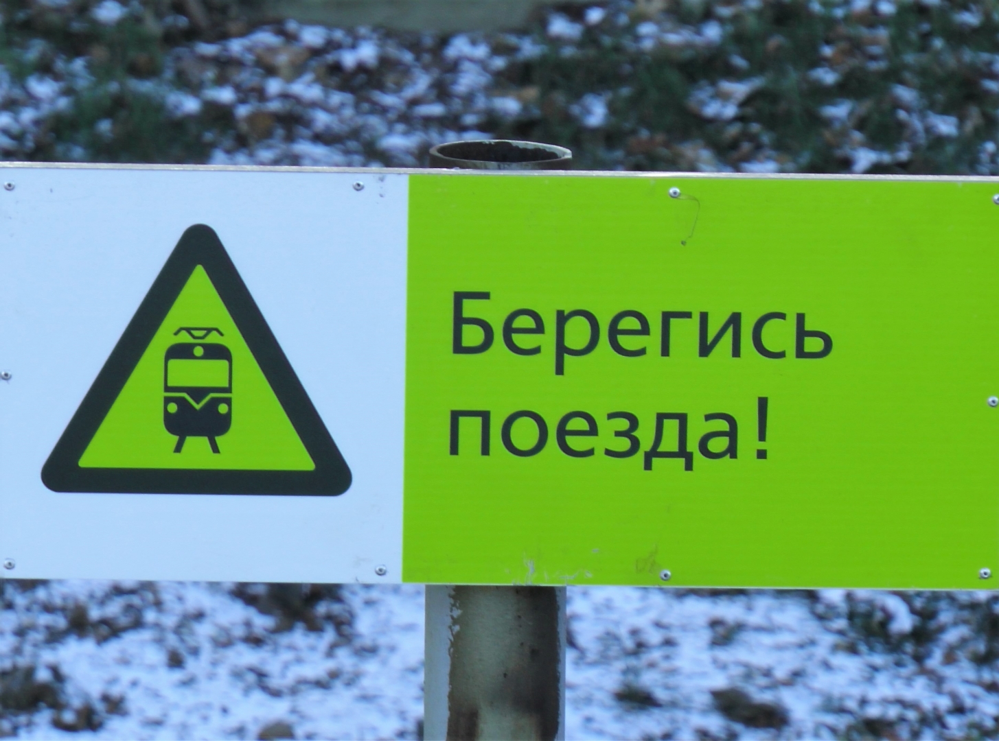 Знак для железной дороги «Берегись поезда» на жёлтом фоне