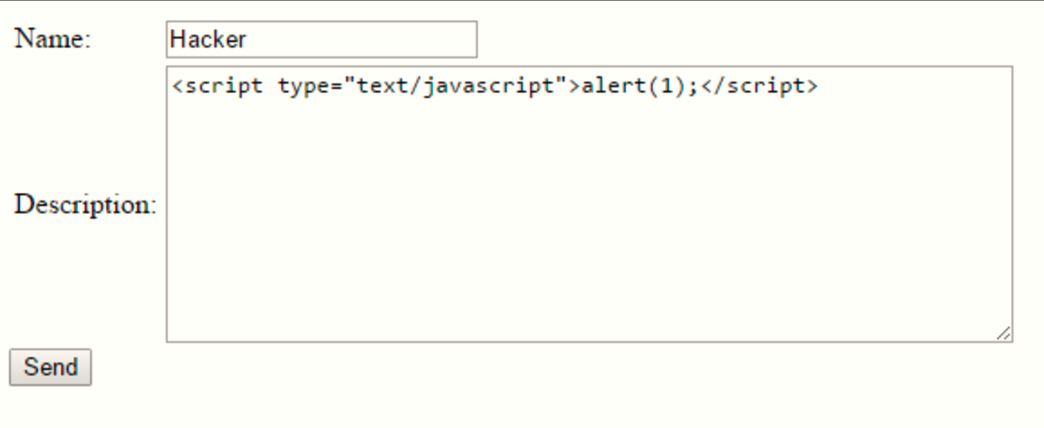 Данная форма довольна проста в практическом объяснении: хакер на вашем сайте в любом поле где он может ввести нужный код на JS(Javascript), допустим: