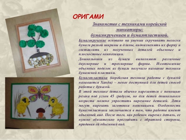 При конструировании из бумаги дети учатся различным приёмам работы, таким как сгибание, многократное складывание, надрезание, склеивание . Работа с бумагой позволяет развить у детей способность работать руками, приучить к точным движениям пальцев . . .