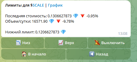 У бота есть функция лимитов для уведомлений, которая позволяет настроить уведомления на определенные уровни цен. Это очень полезно, если хотите купить или продать токены на определенном уровне цены. Для себя поставил я поставил уведомления для токенов: $BOLT, $SCALE, $KINGY. На момент написано этого поста, я у меня уже имеются токены $BOLT и $KINGY - пусть немного, но что есть. Так, что покажу свои лимиты для токена $SCALE.