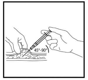 With your free hand, gently pinch the skin around the injection site between your Insert the needle into the tissue beneath the skin's surface at a 45° to 90° angle to reduce Holding the syringe in place, pull back (if there is blood in the syringe, it means you have entered a blood Do not inject