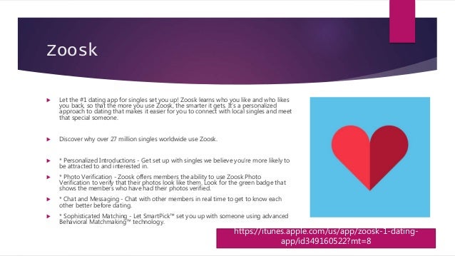 Download Zoosk - # 1 Dating App for iOS to with the # 1 dating app , 3 million messages sent daily, 8 million verified photos, and 38 million members worldwide youll enjoy meeting singles on a . . .