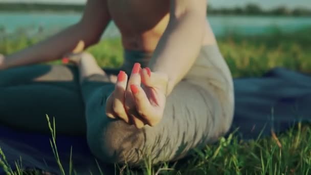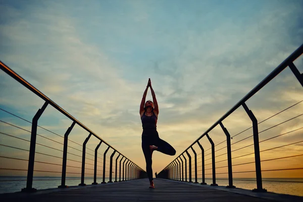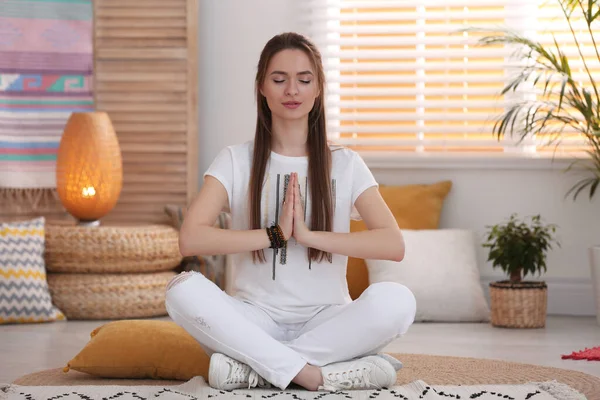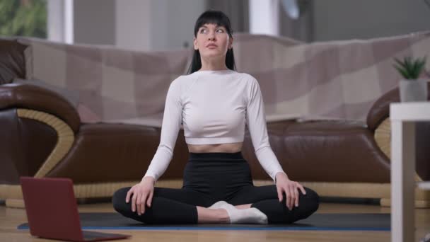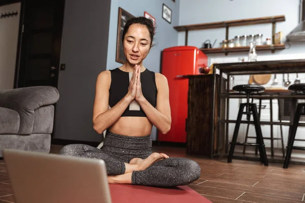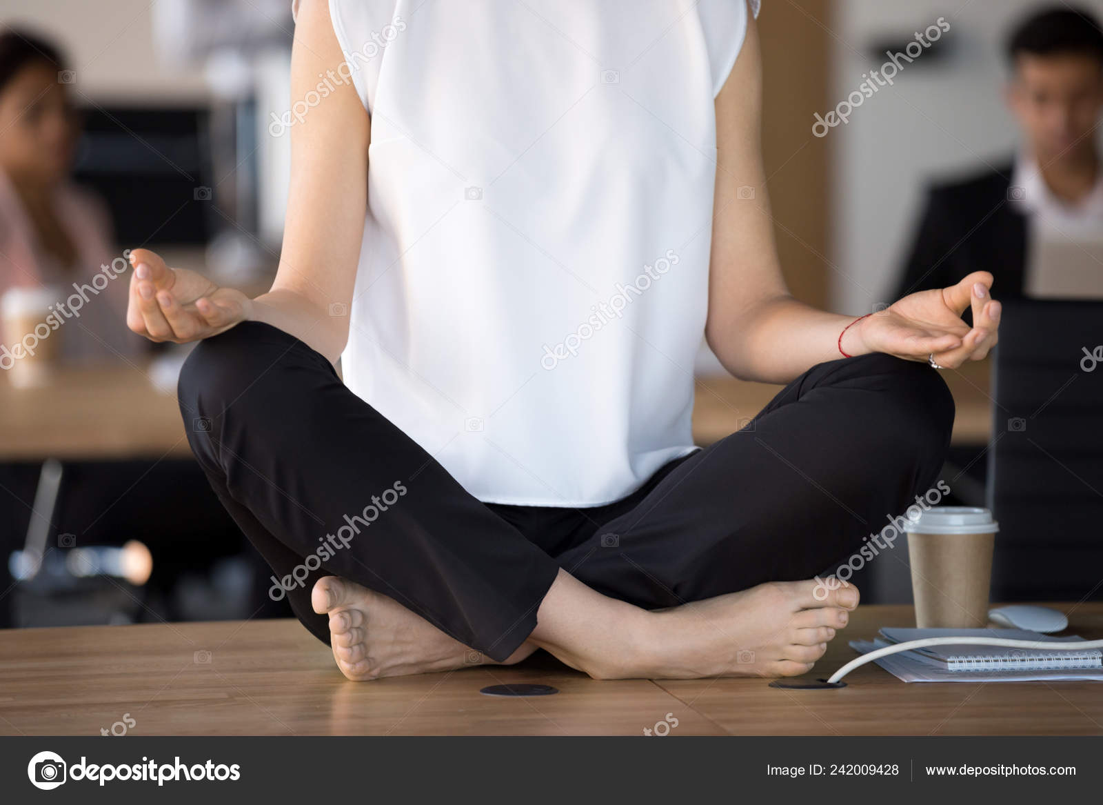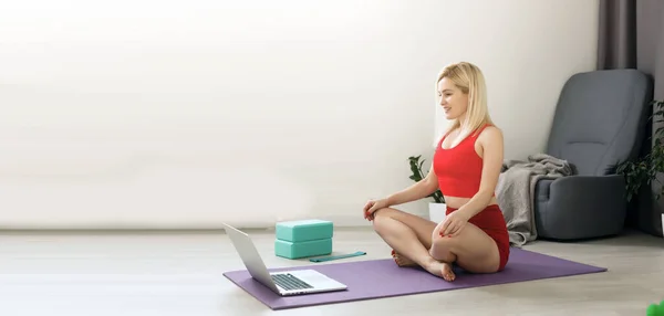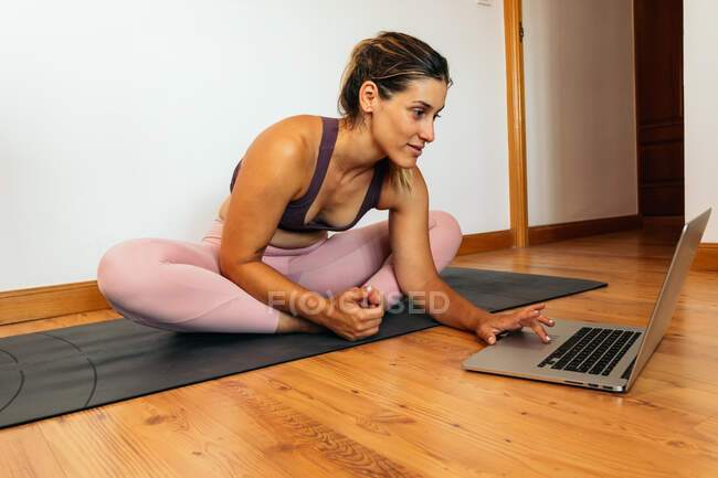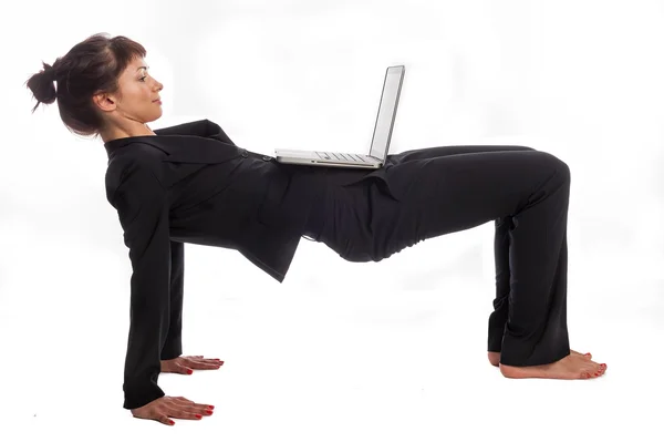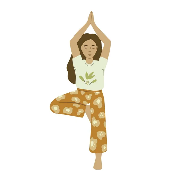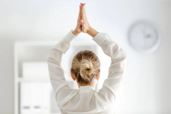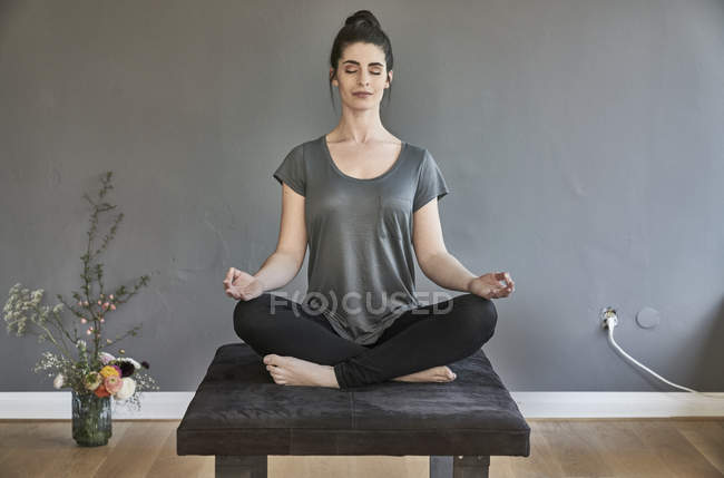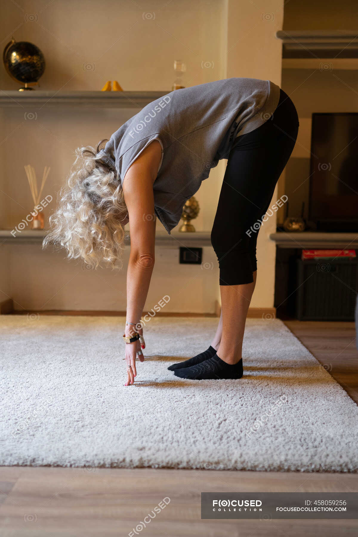 Зрелая дама занимается йогой у себя в кабинете