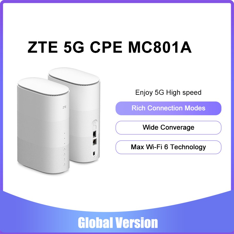 ZTE MC801A is a 5G Indoor WiFi router supporting the latest Wi-Fi 6 access technology, allowing multiple users to access the 5G network at the same time . ZTE 5G Indoor CPE MC801A supports both NSA & SA 5G Networks, compatible with mainstream 4G and 5G standards . The device enables consumers to enjoy the advantages of ultra-fast 5G networks and 5G . . .