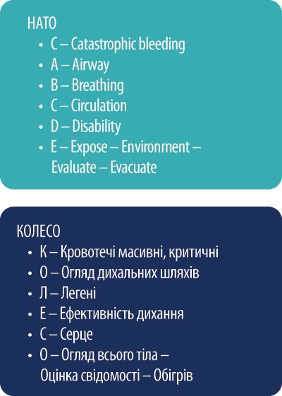 Зазвичай для огляду пацієнта використовують алгоритм ABCDE, але в травмованого пацієнта ми використовуємо систему CABCDE (або MARCH у військових), тому що у травмованого пацієнта поки не зупините критичну кровотечу, не зможете розпочати реанімаційні заходи, бо вони будуть не ефективні, якщо людина ще жива, то швидко зможе стати трупом, тому в огляді критичного травмованого пацієнта С - виходить на перший план.