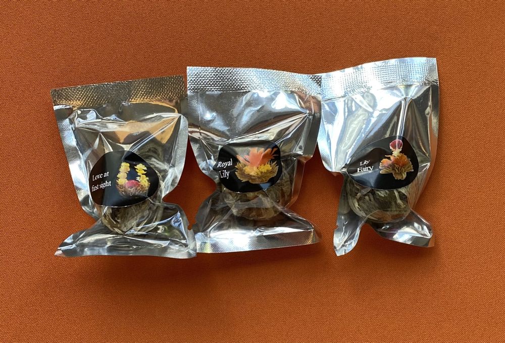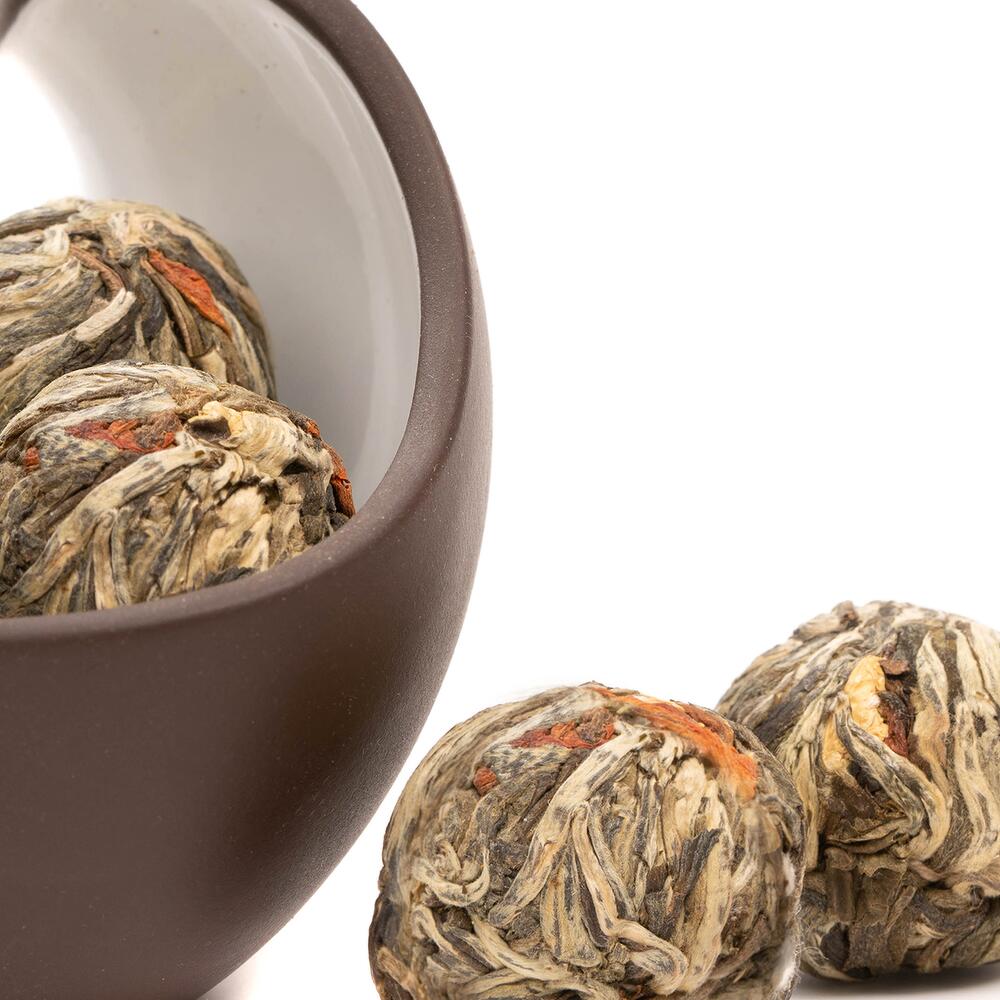 Расцветающий (связанный) чай выглядит как маленький шарик из высушенных листьев и цветка . При заливании горячей водой происходит его распускание . «Цветение» занимает около 10 минут .