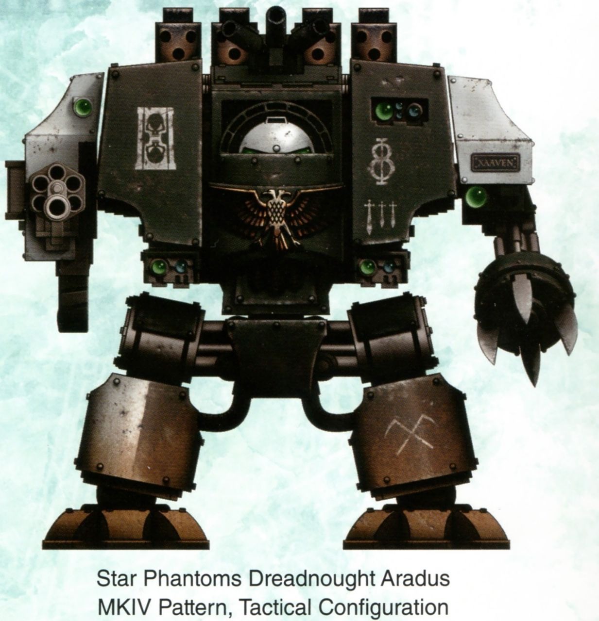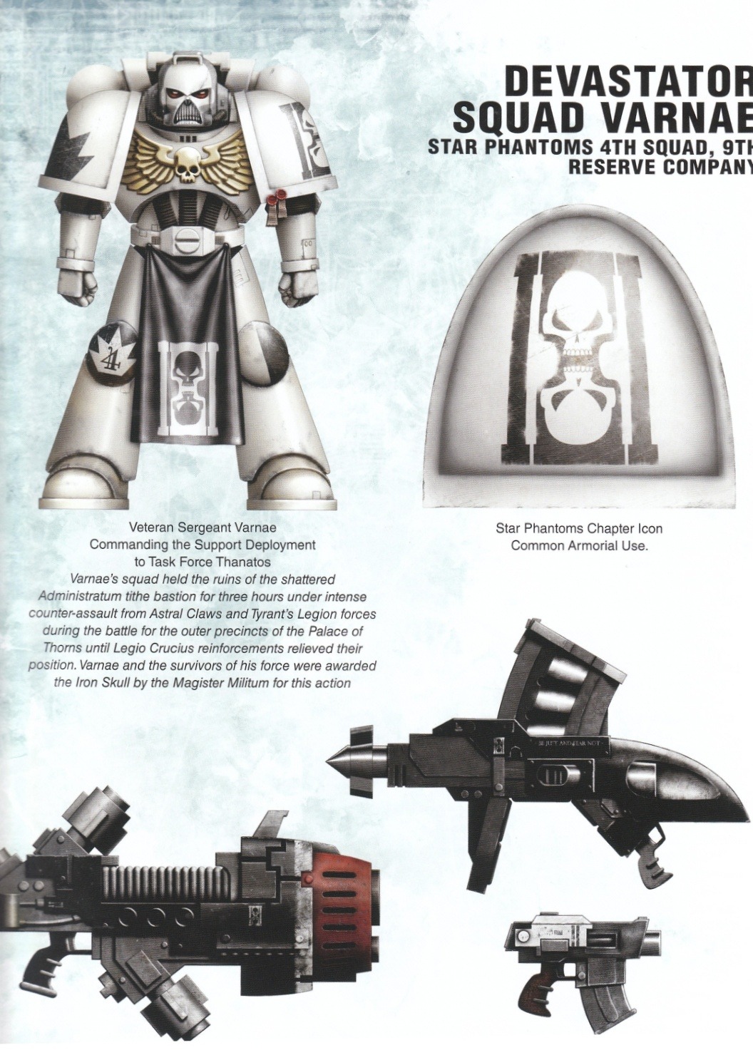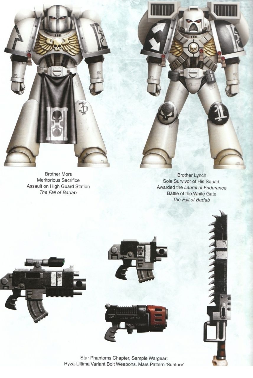 Примечание: Похоронный Культ Империалис. Существование местных и зачастую уникальных систем верований, воинской философии и отклонений от Культа Империалис среди Адептус Астартес – отнюдь не редкость. Они разнятся от весьма незначительных превратившихся в ритуалы традиций ордена, которые можно найти у многих наследников Ультрадесанта, до полностью самобытных культурных явлений крайне неортодоксальных орденов, таких как Космические Волки. К числу последних можно отнести так называемый Похоронный Культ Звёздных Фантомов, понимающий божественность Бога-Императора Человечества как ‘Императора Мортифекса’ – Судии душ умерших и хранителя мучеников. В свою очередь себя братство ордена считает направляемыми Божьей волей убийцами, Ангелами Смерти в истинном смысле этого слова. Все действия Звёздных Фантомов сопровождает мрачная торжественность, и они уделяют мало внимания личной славе воинов, полностью отдавая себя принесению смерти тем, кто отрицает волю Императора или же стремится помешать его святому замыслу. ‘Лишь в смерти закончится долг’ – таков стержень убеждений верных догматам Империума Фантомов, и хотя орден мало щадит живых, он глубоко чтит тех, кто пал на службе Императору, и с великим почтением относится ко многим мученикам и своим погибшим братьям. Замечено, что частью практик Звёздных Фантомов являются многочисленные странные и замысловатые погребальные обряды, а боевые братья ордена часто носят как талисман личные реликвиарии с обетными предметами, такими как прах павших товарищей, а также посыпают доспехи смешанными с землёй молотыми костями врагов. Капелланы Звёздных Фантомов являются верховными жрецами и хранителями ритуалов культа. Для проведения обрядов в каждую роту и подразделение направлены Похоронные Капелланы, а отдельная часовня четырёх реклюзиархов и Магистра Святости является ключевой частью командной структуры ордена.