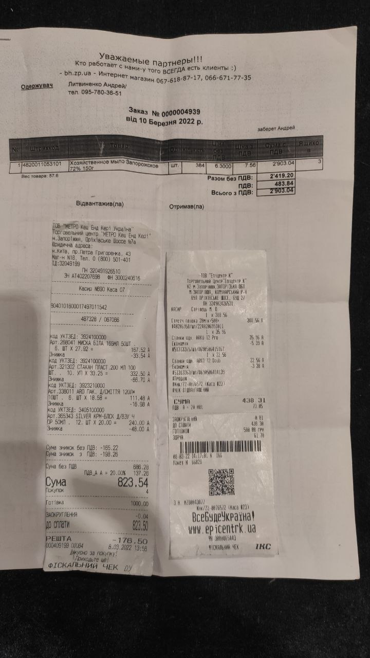 Придбали хоз.товар на суму 2903.04 грн та одноразовий посуд 1261.85 грн.