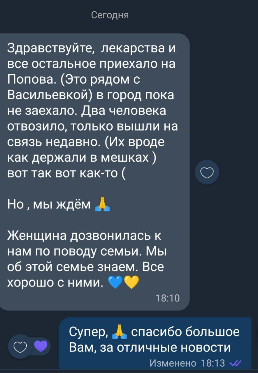 Найголовніше!!! Ліки, які були закуплені для жителів та захисників Василівки, нарешті доїхали до адресатів!