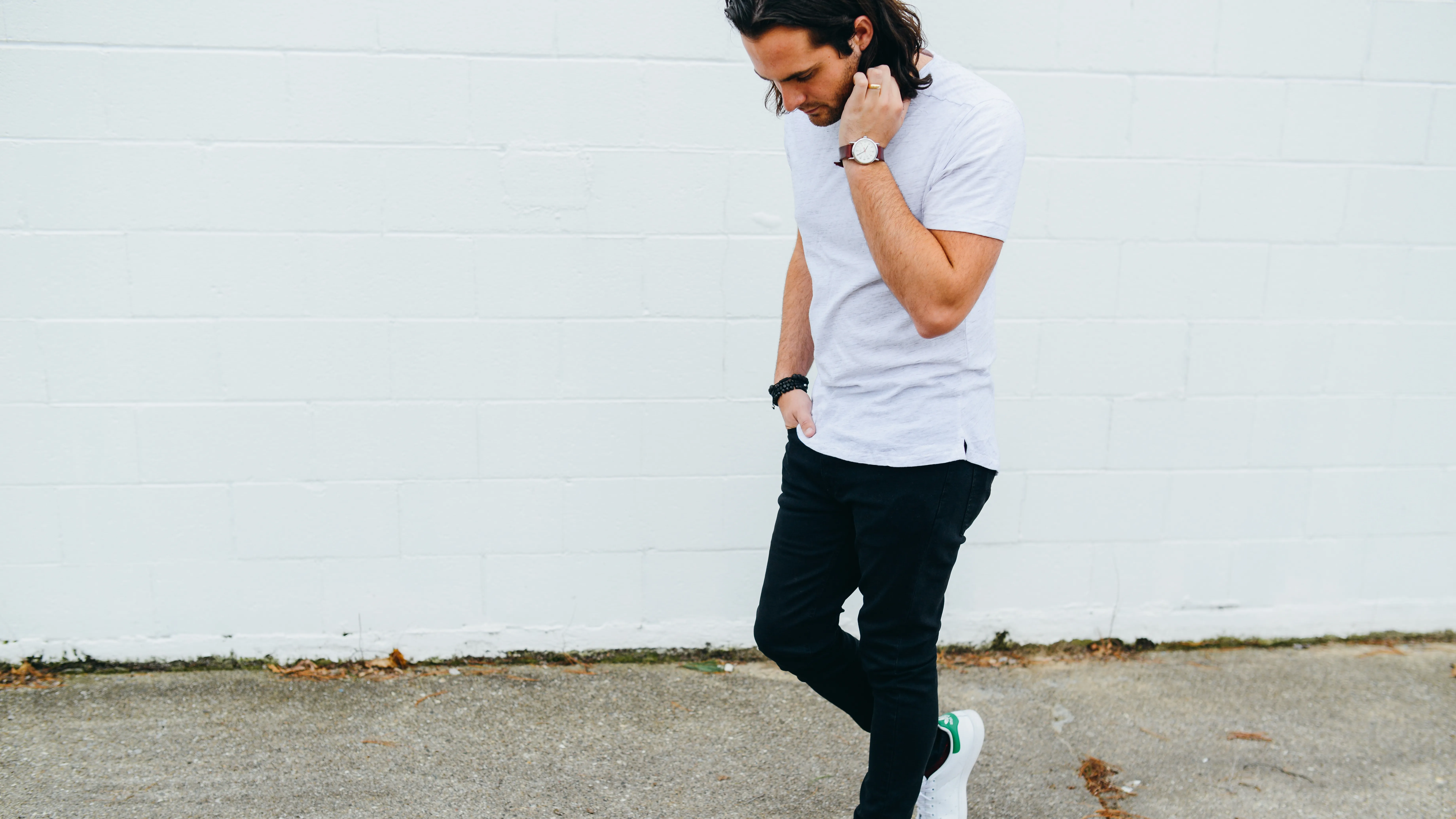 GIrl mit dunklen Haaren reibt sich an seiner Hose
