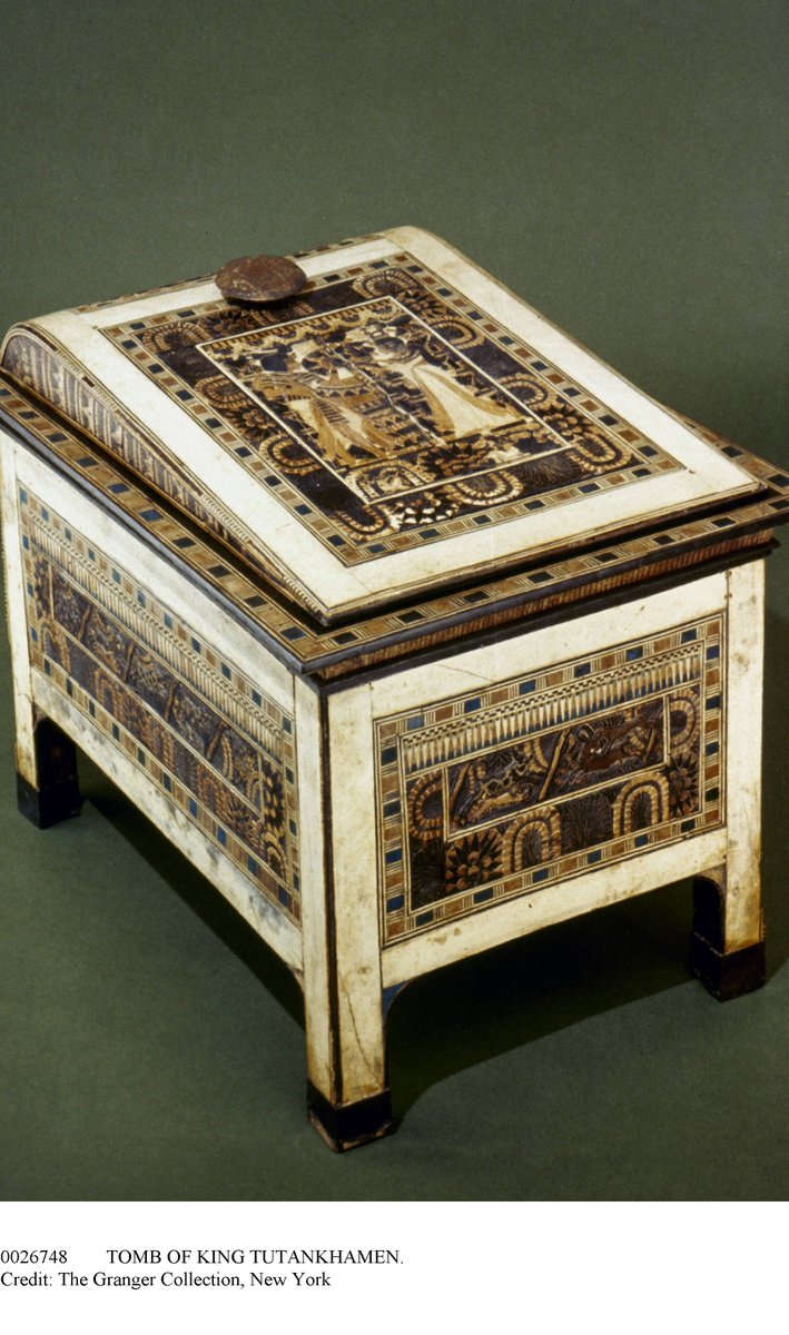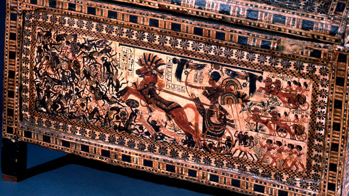¿Pero era un rey guerrero? Parece que no mucho. Realmente murió muy joven y solo lanzó sus tropas para combatir a los hititas en el último año de su reinado. Aún así, la tradición mandaba representarlo como un victorioso militar. En este baúl se le ve aplastando a sus enemigos.