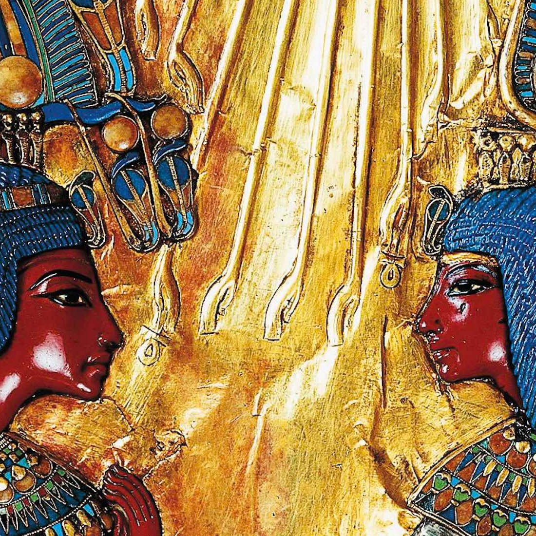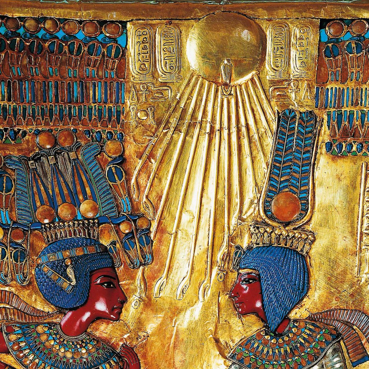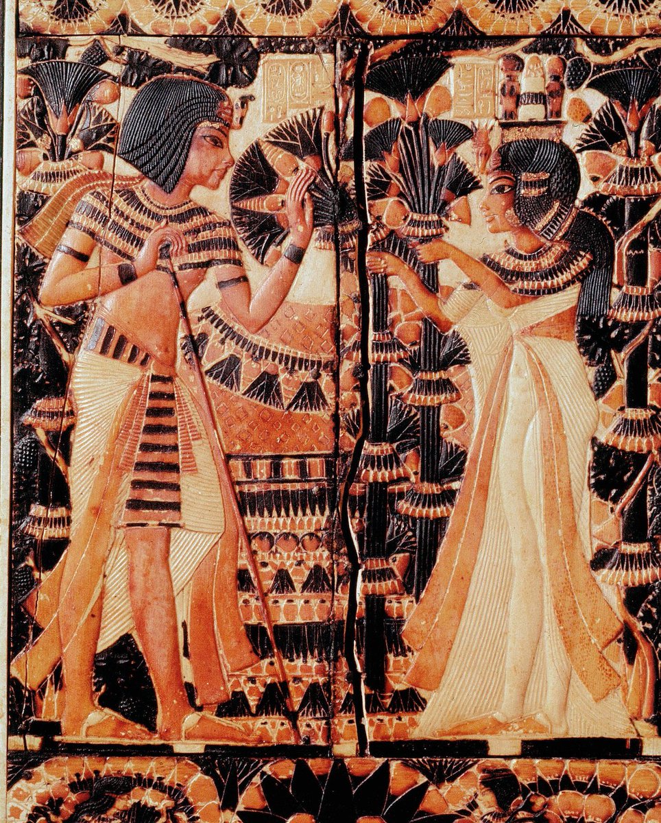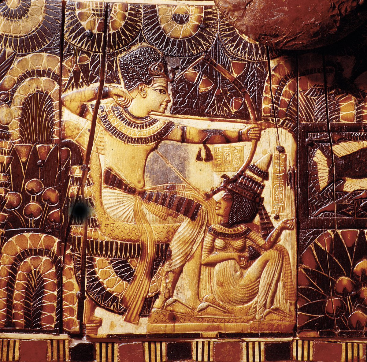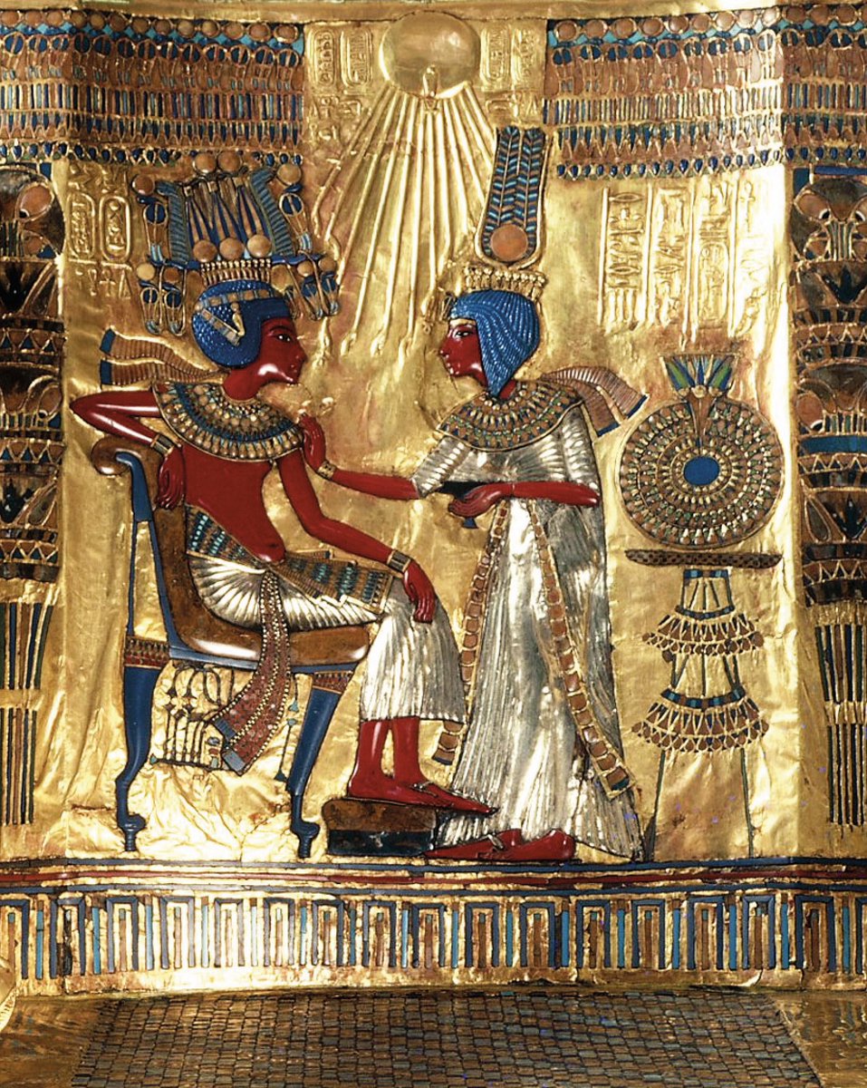 En el respaldo aparecen Tutankamón y su esposa, Ankesenamón. Es un trono de adulto que fue reutilizado por Tutankamón (que murió con 18 años). Una teoría es que perteneció a su padre, Akenatón, y que las figuras, originariamente, lo representarían a él y a su esposa Nefertiti.