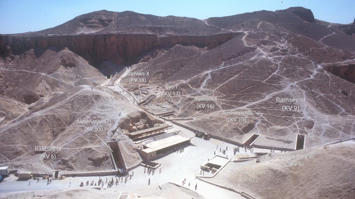 En el Valle de los Reyes, los faraones no se enterraban en grandes pirámides, sino en hipogeos, que se cubrían bajo toneladas de escombros y arena. KV significa King’s Valley y el número es su orden de hallazgo. La de Tutankamón fue la sexagésimosegunda (62ª) tumba hallada