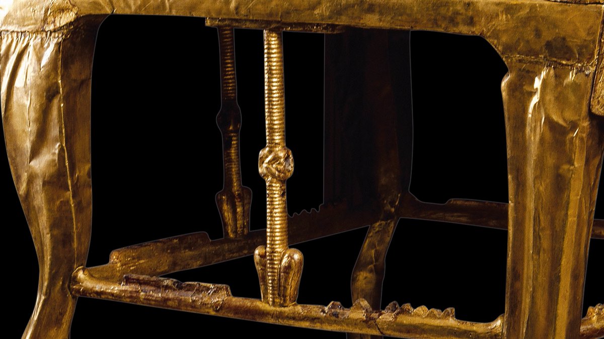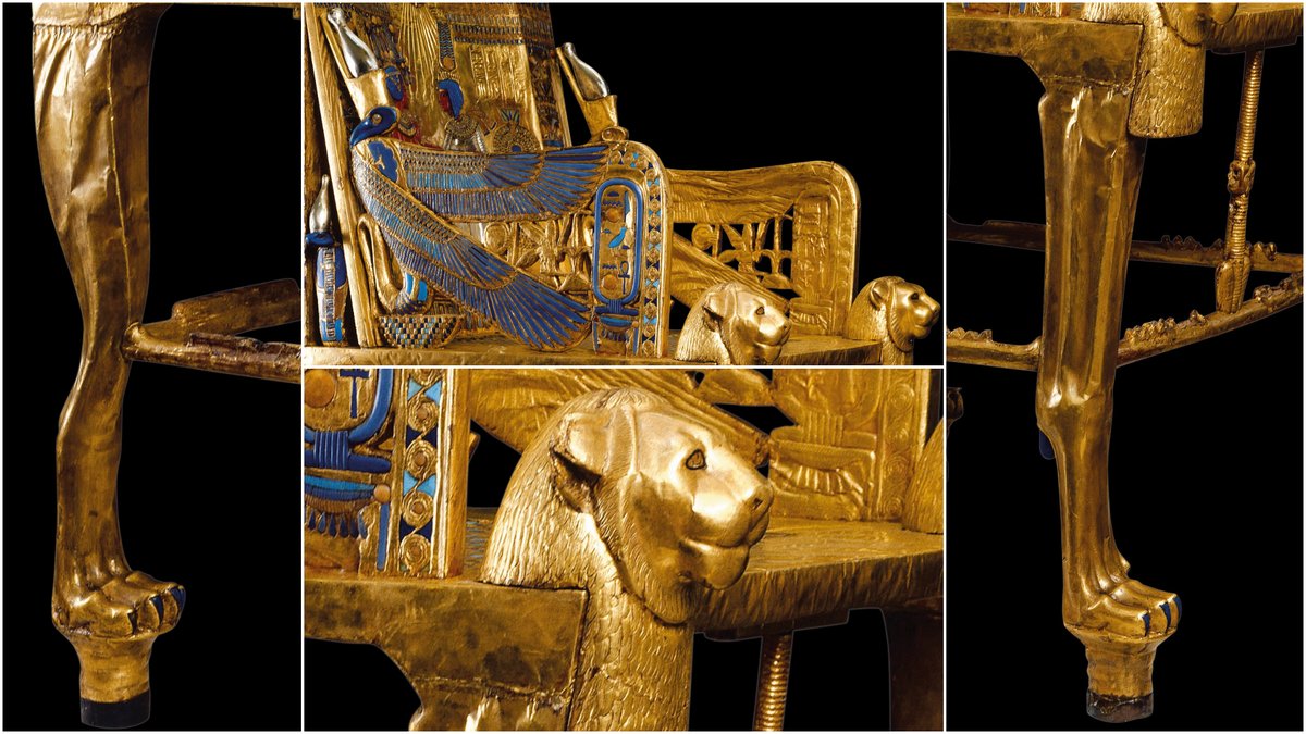 El trono tiene unas tráqueas que servían para reforzar el asiento, en las que faltan el loto y el papiro anudados (un símbolo de Egipto). Una teoría dice que el pequeño Tut, intranquilo por tener que estar sentado horas en un trono, movía sus piernas y lo rompió.