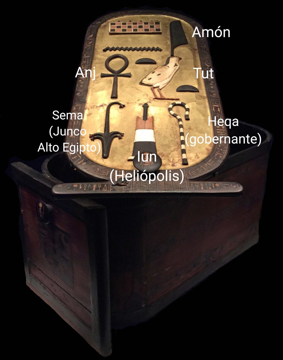 En esta caja pusieron su nombre tras la vuelta al culto de Amón. En la tapa, bien grande para que no hubiera confusiones: Tutankamón, "imagen viviente de Amón. Gobernante de Heliópolis del Sur"