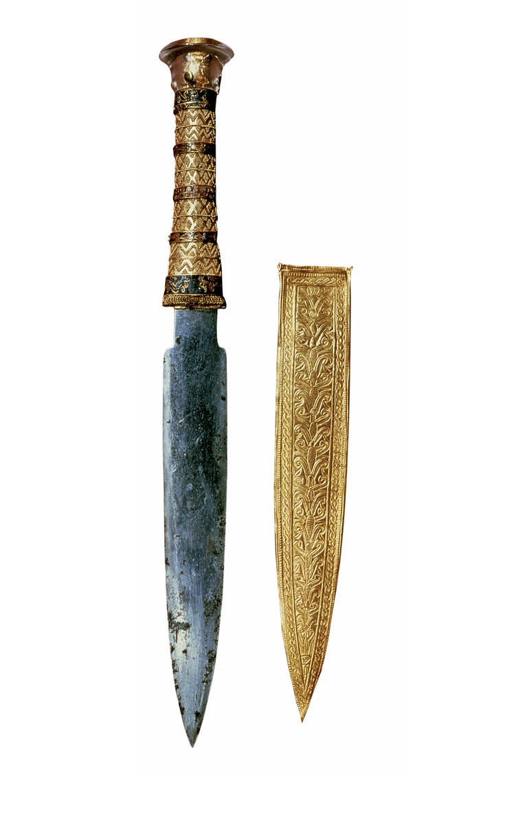 Fuera o no un buen guerrero, una de las piezas más espectaculares de la tumba es un arma. Una daga de 35 cm que se encontró bajo las vendas de su momia. Su empuñadura es de oro y la hoja es de origen alienígena, como Superman: el metal proviene de un meteorito.