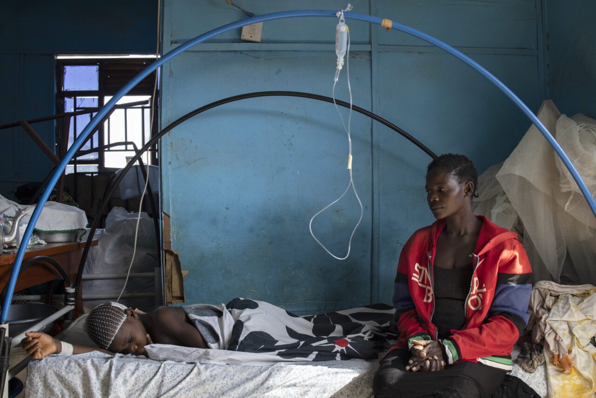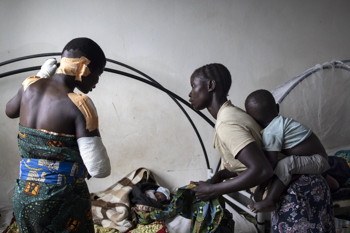 "Un niño de 14 años descansa en el hospital vigilado por su tía. Recibió varios machetes en la cabeza durante un ataque a su aldea. Su madre y dos hermanos menores fueron asesinados."