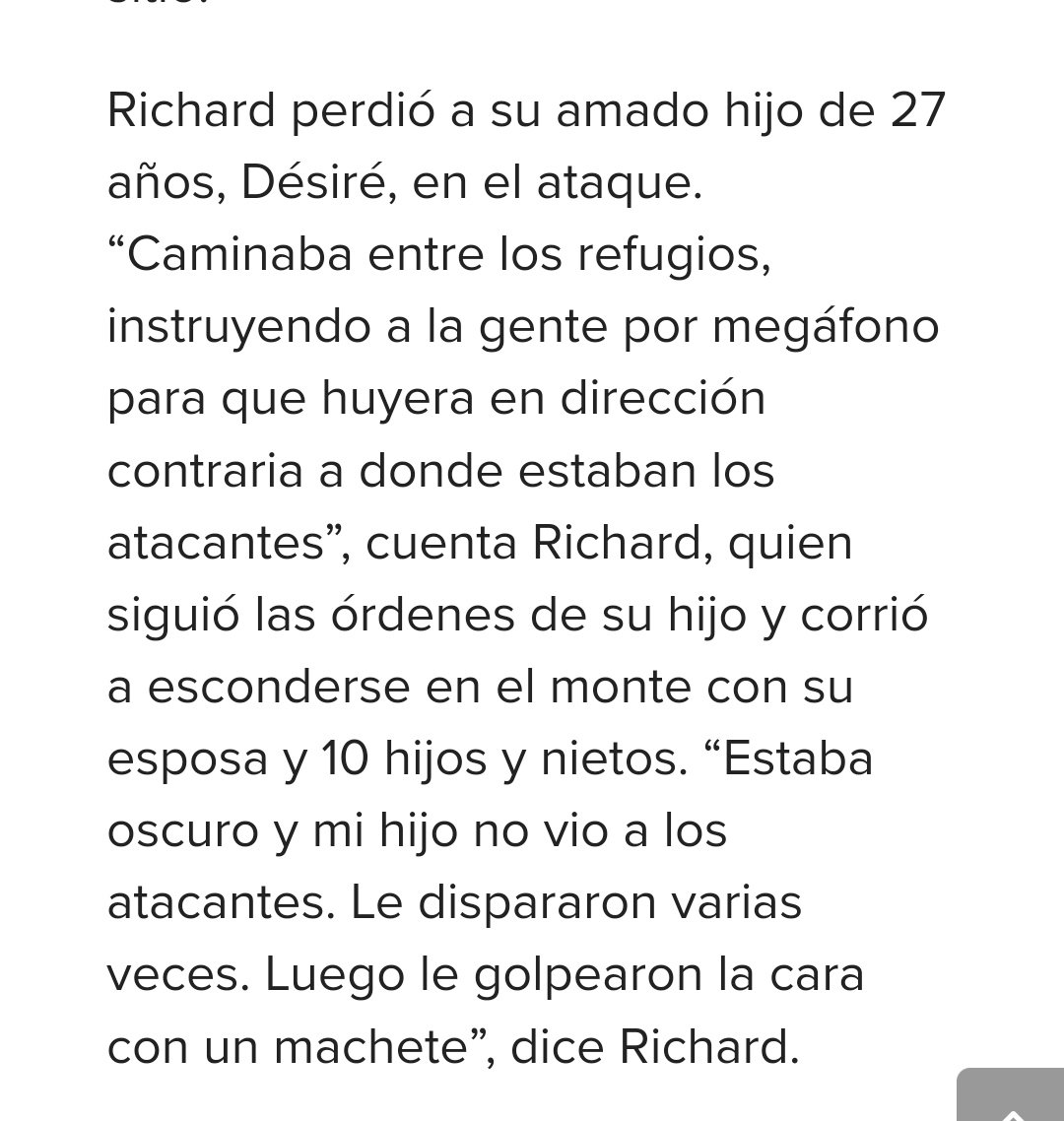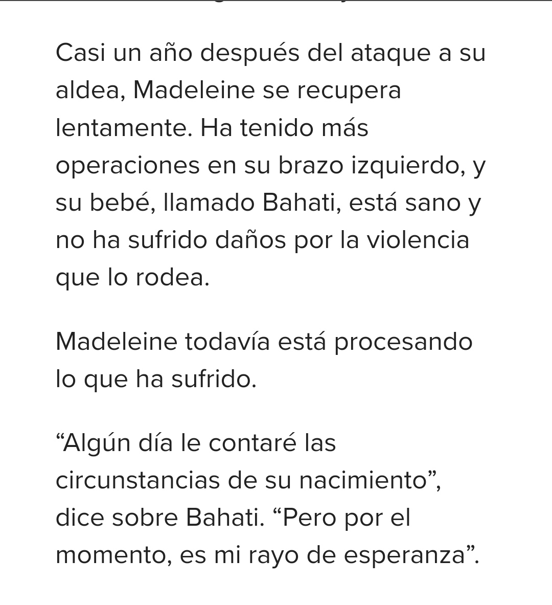 "A las 4 am, Madeleine se despertó de golpe. “Los atacantes aparecieron de repente, llegaron a nuestro pueblo a pie, blandiendo machetes y pistolas”, dice. “Asaltaron todo el pueblo, yendo de una casa a otra”."