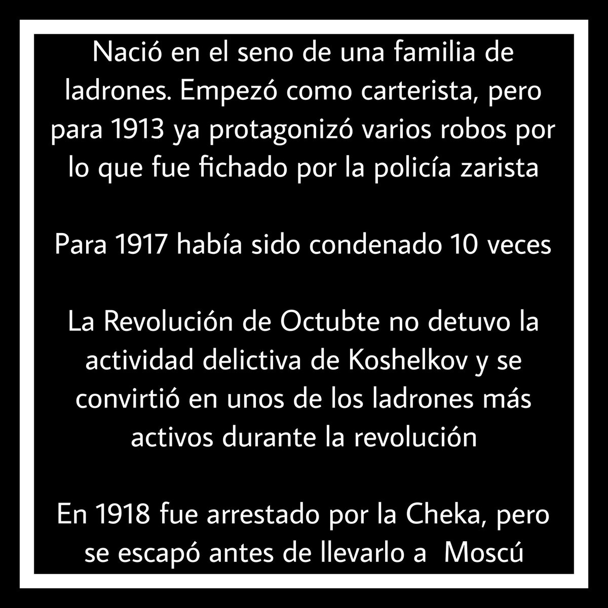 Para 1917 Koshelkov había sido detenido y condenado diez veces, pero siempre se las ingenió para escaparse y continuar con actividad criminal. La toma de poder por parte de los bolcheviques no detuvo a Koshelkov y continuó robando, por lo que fue detenido por la Cheka en 1918.+
