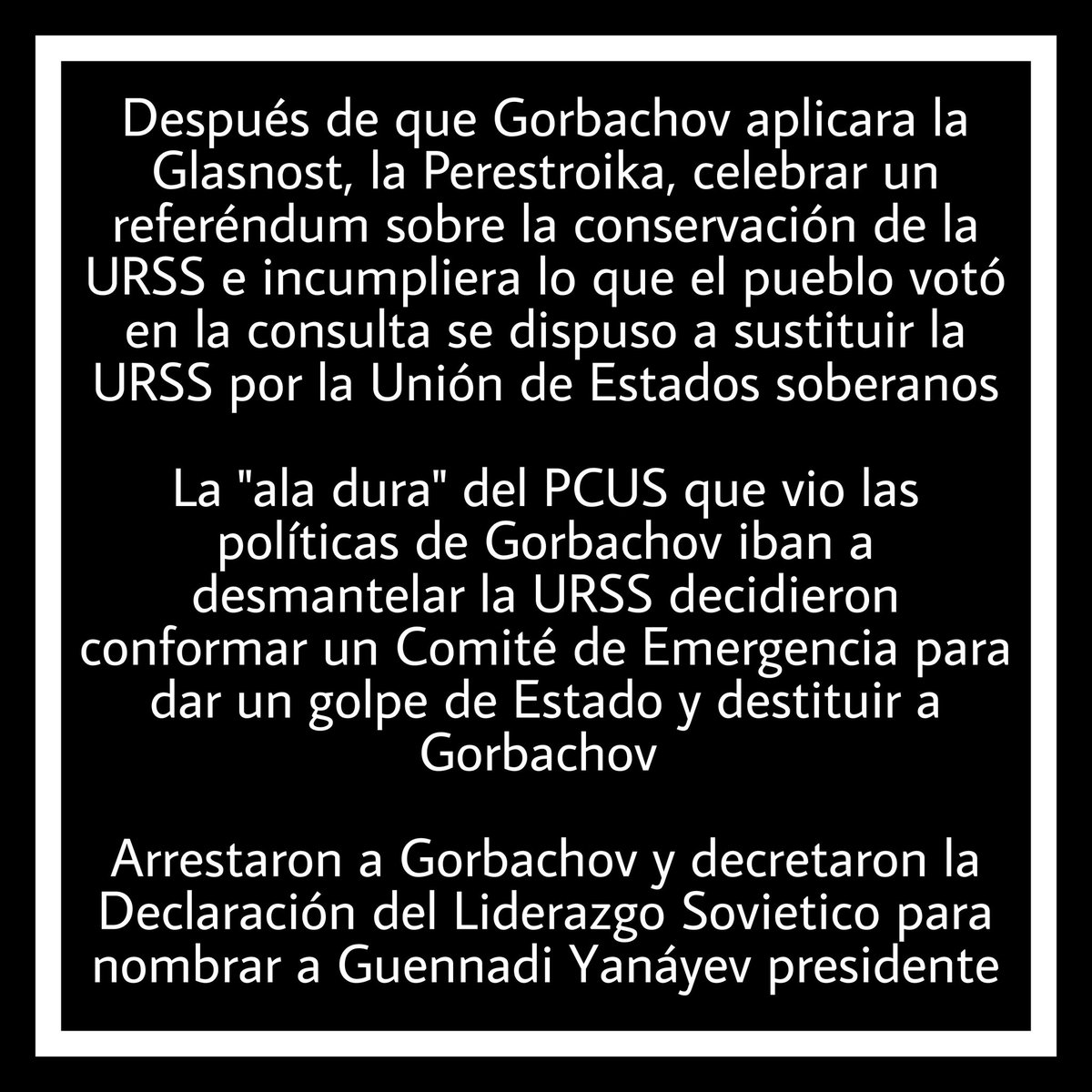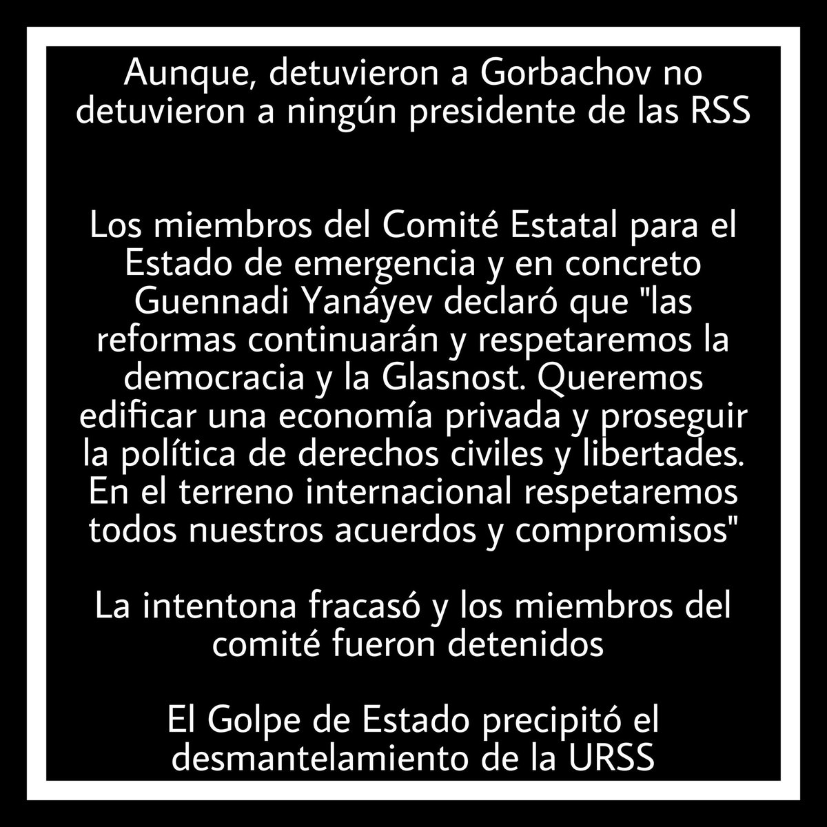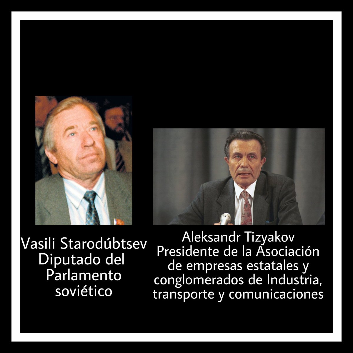Comité Estatal para el Estado de Emergencia para preservar la URSS. Detuvieron a Gorbachov mientras que se encontraba en Crimea de vacaciones, firmaron la “Declaración del Liderazgo Soviético” y Guennadi Yanáyev pasó a ser el nuevo presidente de la URSS.+