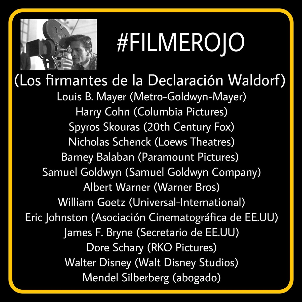 En este sentido, se elaboraron una serie de listas negras en el que metieron a distintos miembros de la intelligentsia estadounidense. En Hollywood varios directores, guionistas y actores fueron metidos en estas listas negras y fueron tachados de peligrosos comunistas por+