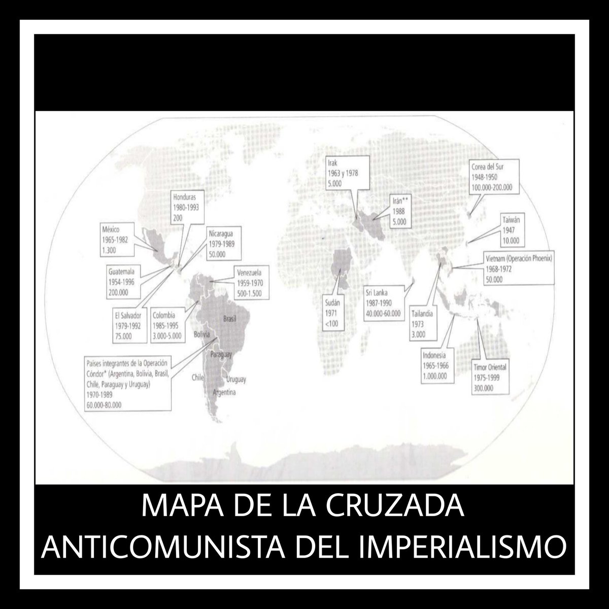 En el libro “El Método Yakarta” del corresponsal estadounidense Vincent Bevins, el autor adjunta el mapa que tenéis en las imágenes y queda bastante claro la cruzada anticomunista internacional que organizó el imperialismo a mediados del siglo pasado.