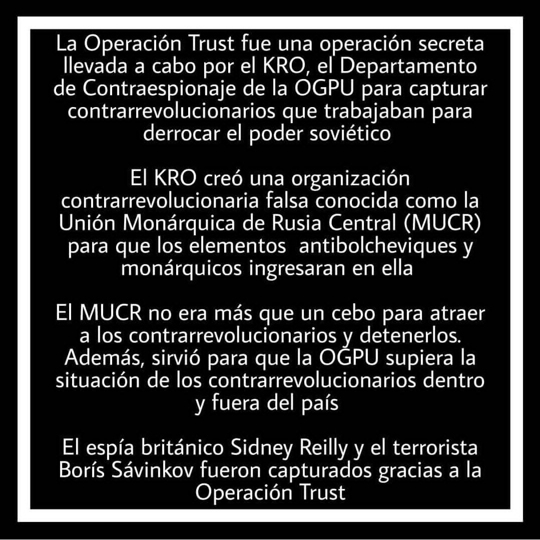 El Departamento de Contraespionaje de la OGPU (Directorio Político Unificado del Estado) organizó una operación para capturar a los contrarrevolucionarios, esa operación fue la Operación Trust.+