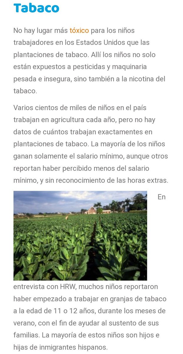 6/ El sector donde + trabajo infantil se explota es la industria agrícola: en EE.UU los niños que cumplen 12 años pueden trabajar en el campo x un numero ilimitado de horas. La única condición es que sea fuera del horario escolar. Cumplidos los 16 años, los niños pueden trabajar