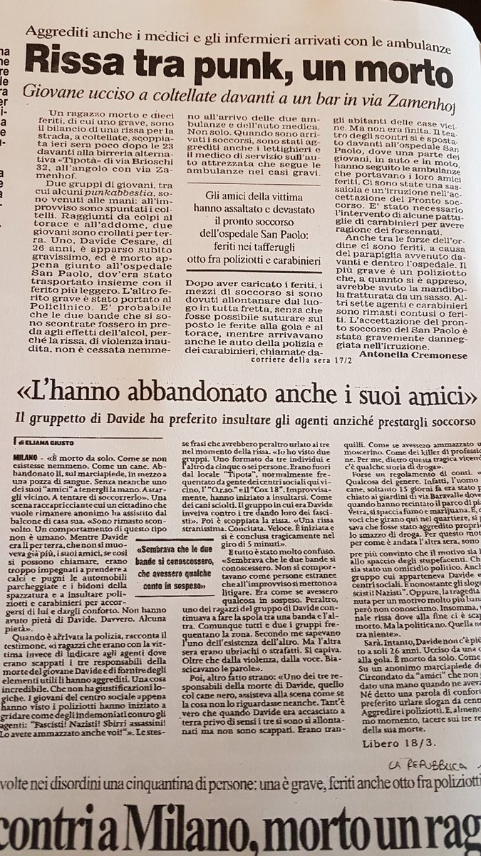 3/ Los periódicos el día después del asesinato fascista de Dax cumplieron con su papel de terroristas blandos: "pelea entre punks", "muerto en los disturbios", "abandonado por sus amigos, que prefirieron atacar a la policía en lugar de atender al amigo herido"...