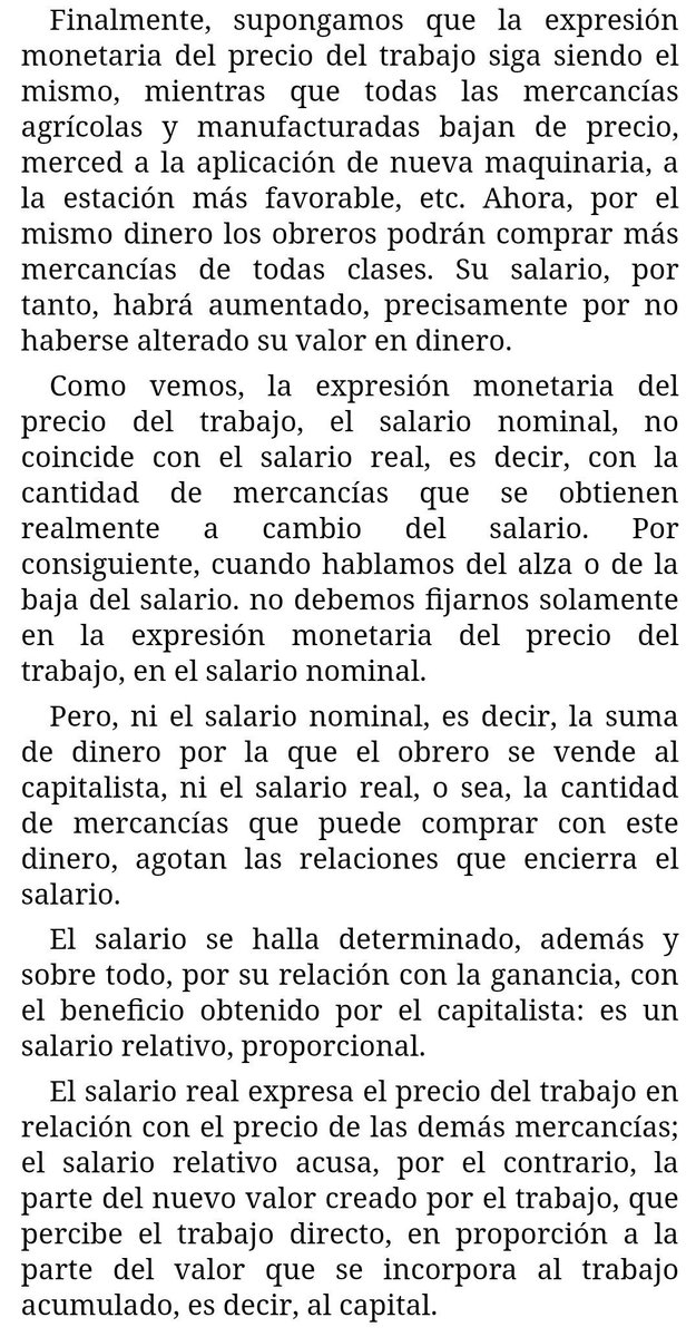 "El salario se halla determinado, además, y sobre todo, por su relación con la ganancia, con el beneficio obtenido por el capitalista: es un salario relativo proporcional. [...] El salario real expresa el precio de las demás mercancía;