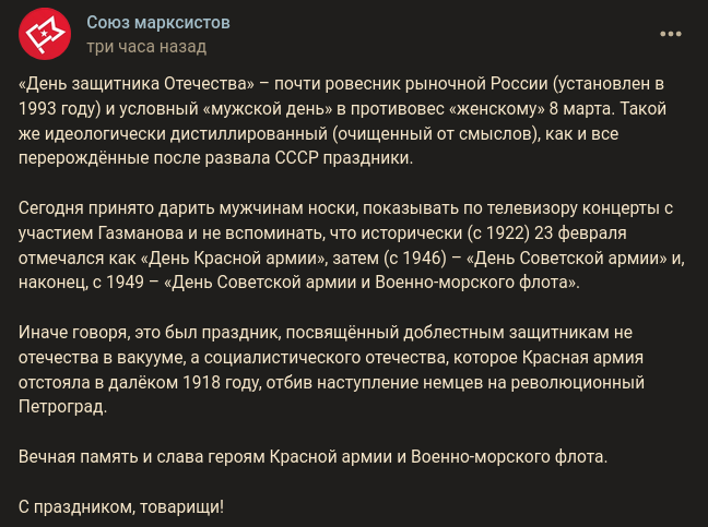 La Unión de Marxistas de Rusia ha publicado este pronunciamiento respecto del "Día de los defensores de la Patria":