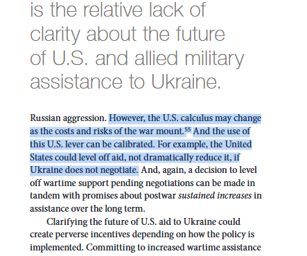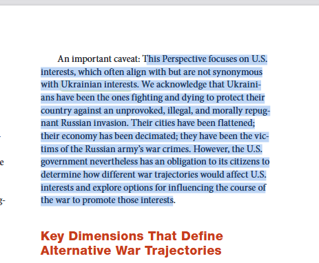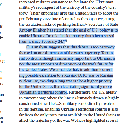 El informe desacredita a Anthony Blinken. Un punto muy relevante. Y dice que los intereses de Estados Unidos son más importantes que garantizar el control territorial de Ucrania por el gobierno de Kiev. Volver a las fronteras de febrero de 2022 no es una opción.