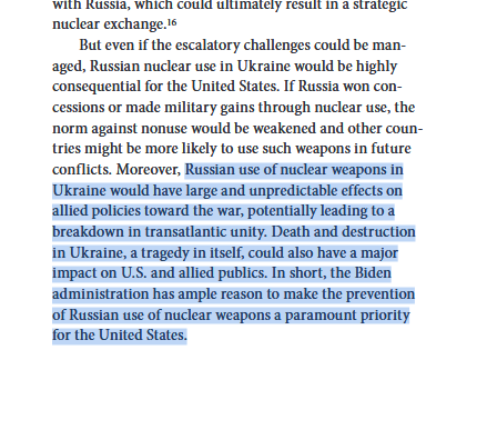 Otro punto interesante: una escalada en el conflicto bélico de Ucrania que llevara a la utilización de armas nucleares provocaría la división de la unidad atlantista. La administración de Joe Biden tiene que evitarlo a toda costa, según RAND.
