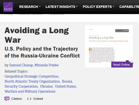 La Corporación RAND, financiada por el Departamento de Defensa de los Estados Unidos, acaba de publicar un informe de análisis pidiendo que se evite una guerra larga en el conflicto bélico de Ucrania, porque es perjudicial para Estados Unidos.