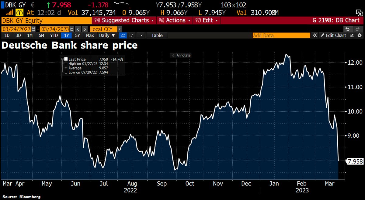 Cayó Credit Suisse, Deutsche Bank cae hasta un 15%, Commerzbank un 9%, Société Générale de France un 7% y sigue el contagio en la banca, mientras la Unión Europea juega a poner sanciones a Rusia, a aislarse del mundo, a subir intereses y a arruinar la economía europea.