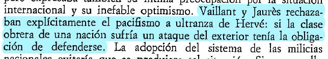Sin embargo, en caso de empezar la guerra se entraba en un lugar de controversia. Del mismo modo, pensaban los pacifistas Jaurès y Vaillant. La teorización sobre el supuesto carácter “defensivo” u “ofensivo” de la guerra empantanaba el debate.