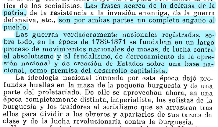 A su vez, la caracterización d guerra defensiva a la guerra imperialista, desde el punto d vista revolucionario, es un engaño al pueblo. No se trataban d guerras de liberación nacional o de derrocamiento del feudalismo, sino d reparto de mercados y esferas de influencia.