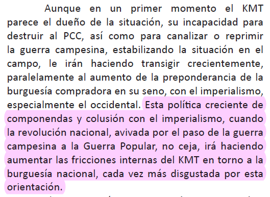 Con un proletariado muy escaso y muy debil políticamente, la KMT fue la plataforma clave para el PCC para convertirse en la referencia de la lucha antimperialista en China. Pero el KMT era un movimiento en el que cohabitaban distintas clases con el objetivo de liberar China.