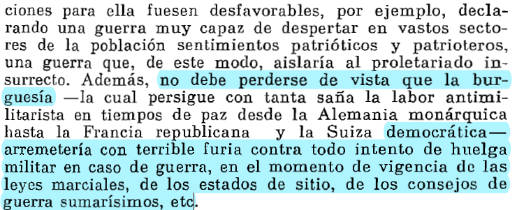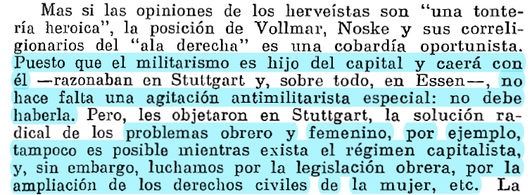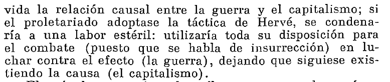 Esto supone la separación de la lucha antimilitarista de la lucha contra el capitalismo, pues no vincula la táctica (huelga) con la estrategia (revolución proletaria), no relacionando el efecto pernicioso concreto con su causa social.