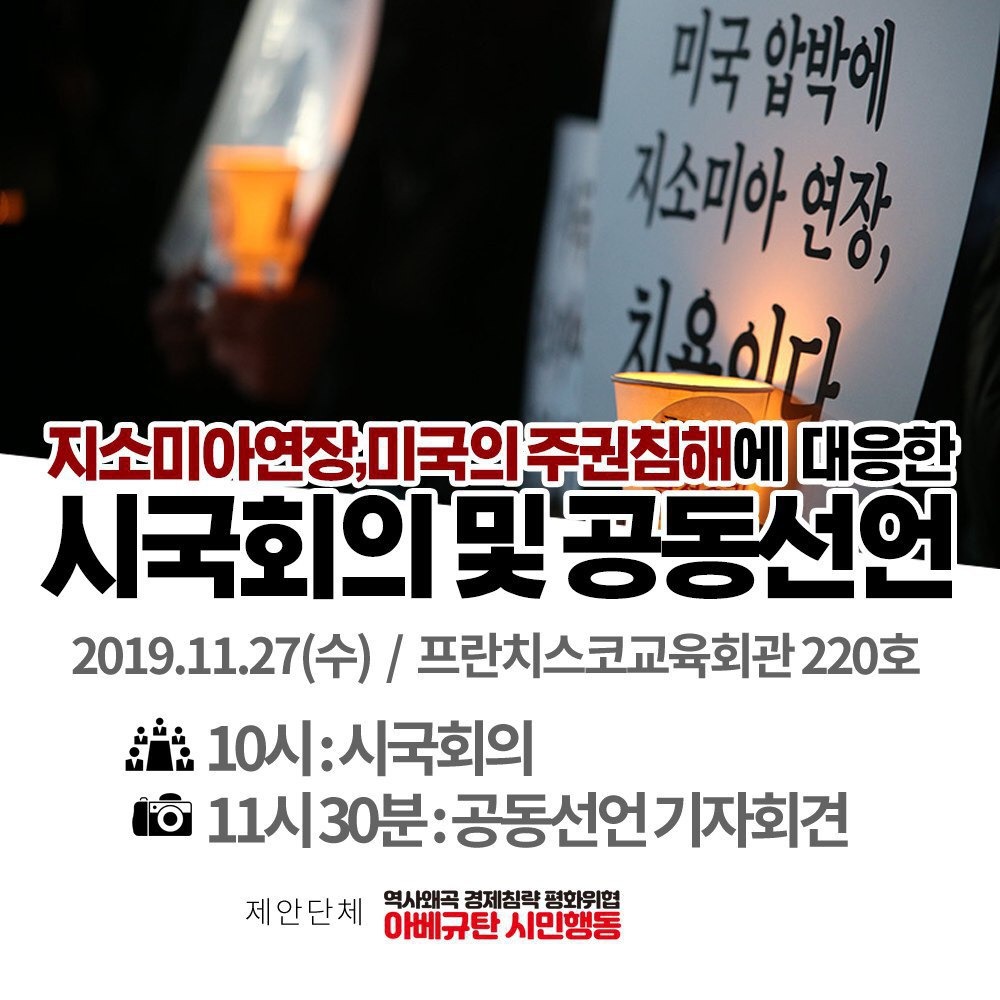 지소미아연장, 미국의 주권침해에 대응한 시국회의 및 공동선언 참여를 요청드립니다. ● 일시 : 2019년 11월 27일 (수) 오전 10시
