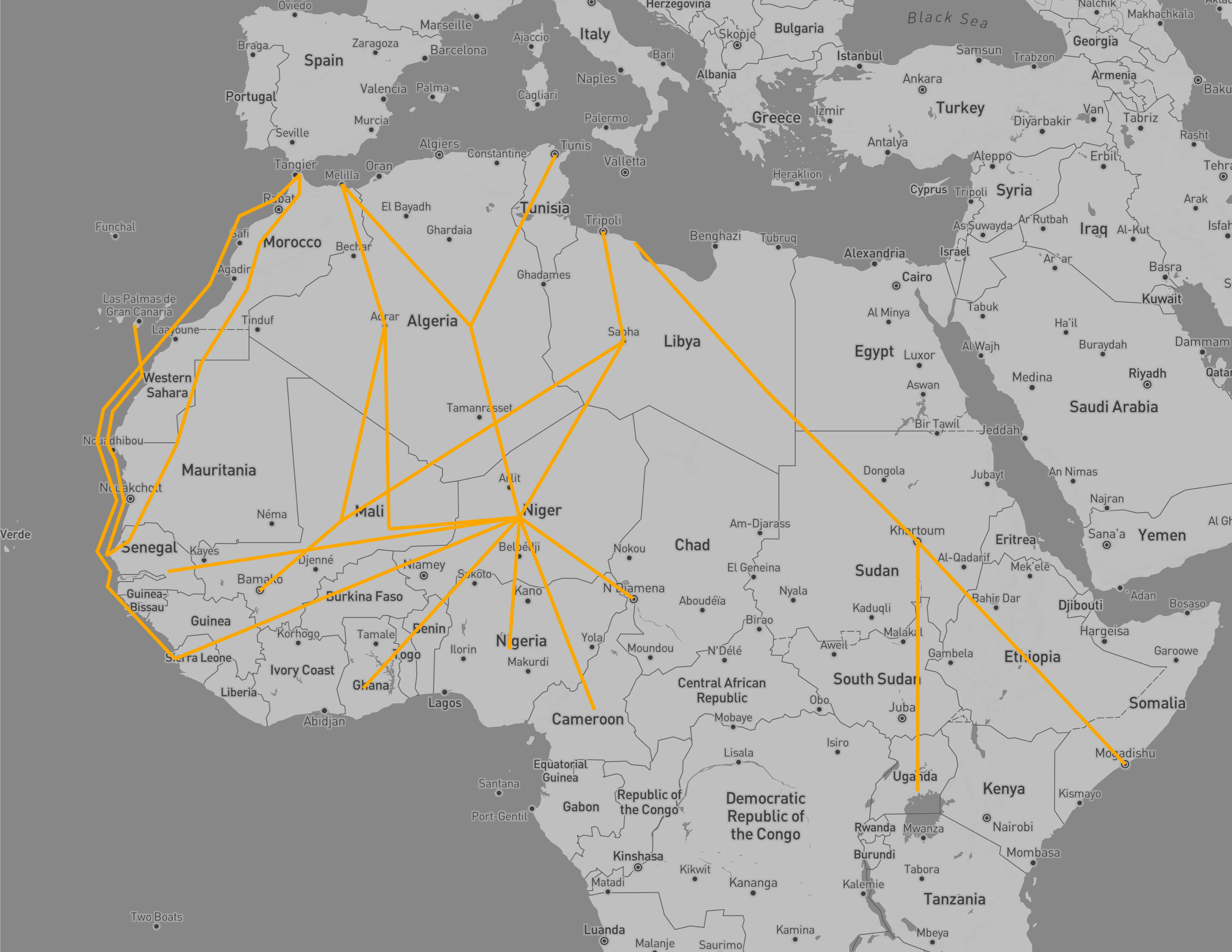 Главные маршруты: из Ливии в Италию и из Марокко в Испанию. Почти все эти пути проходят через Нигер.