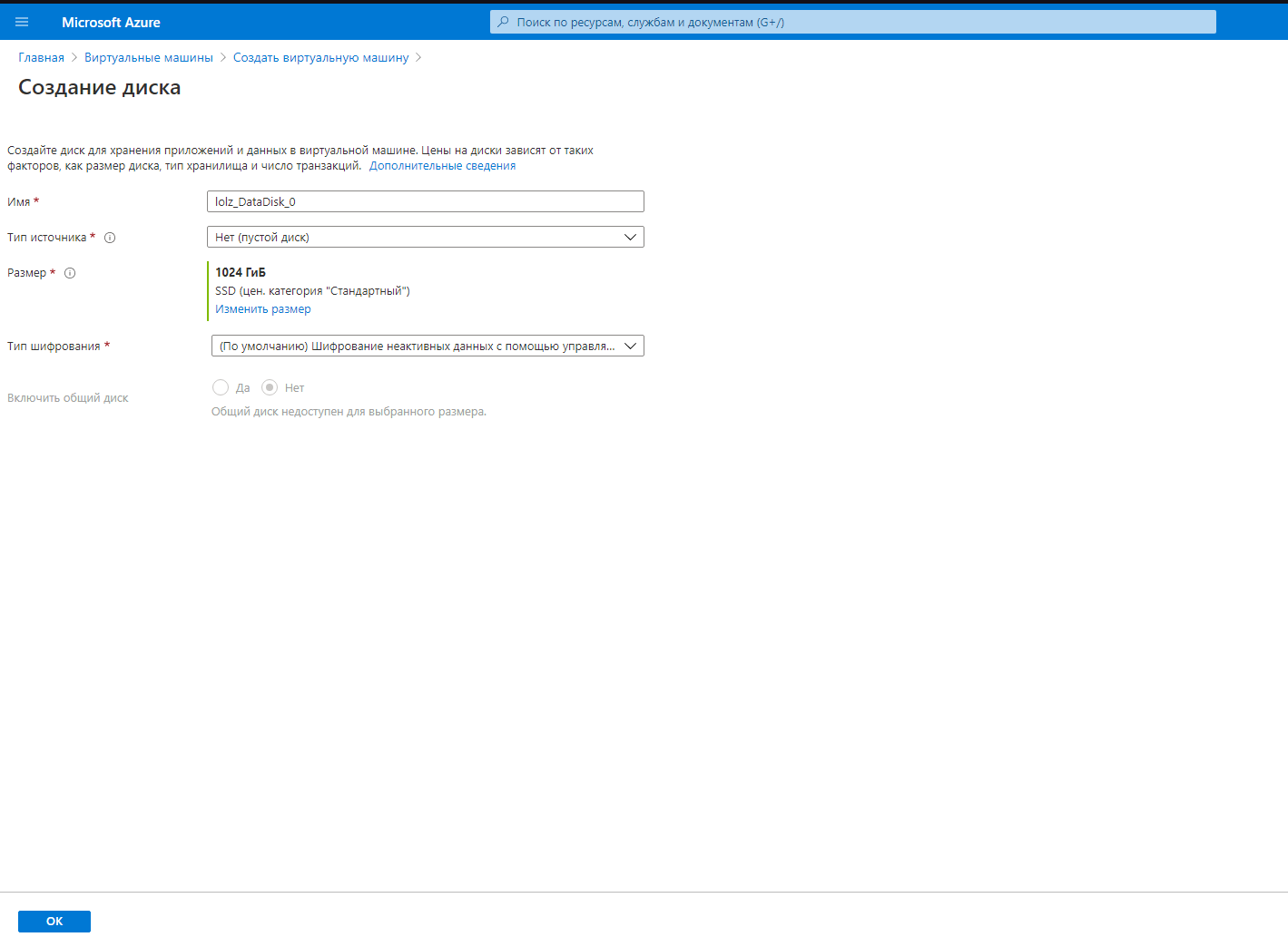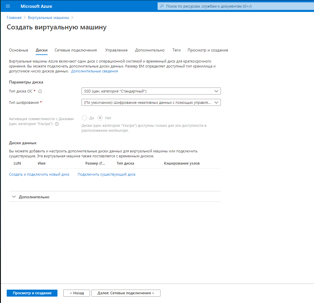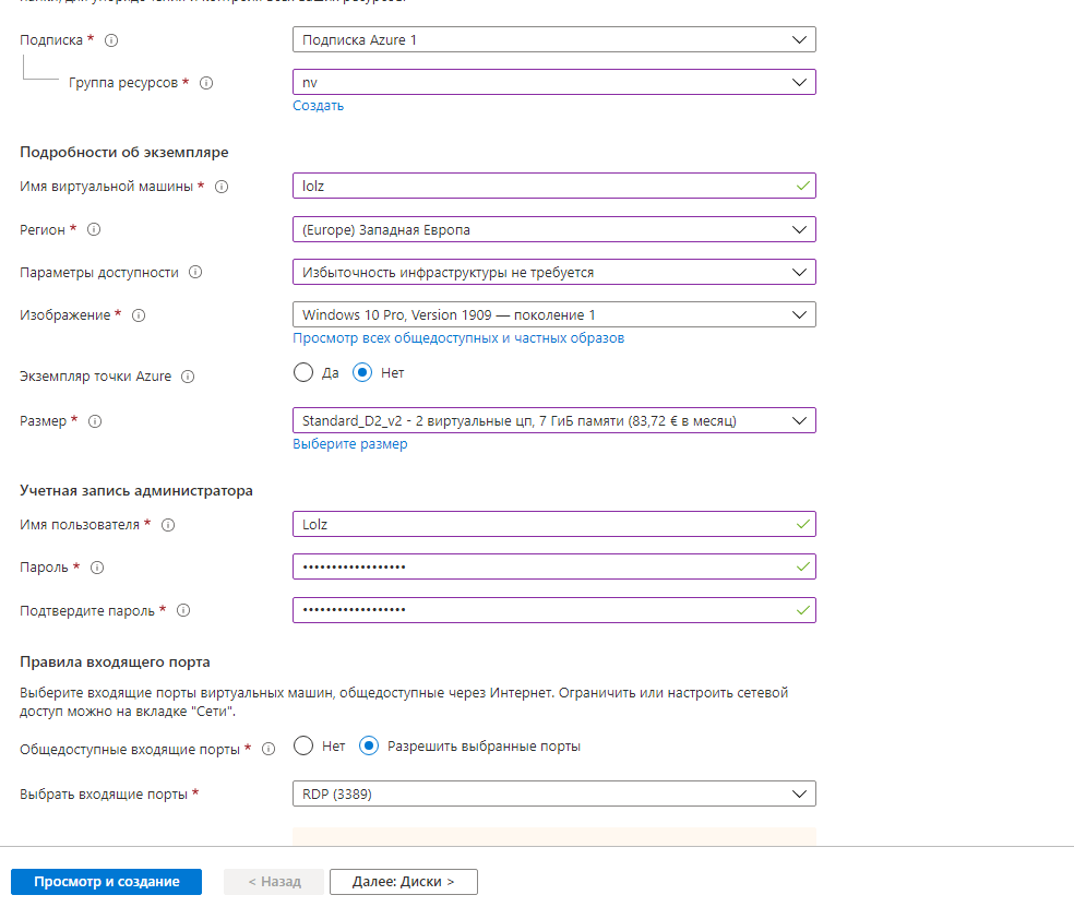 Подписку выбираем "Azure 1"
