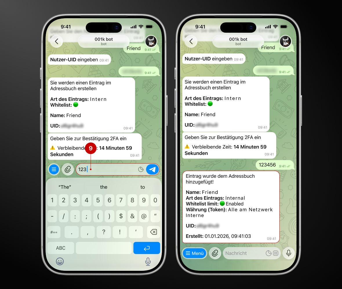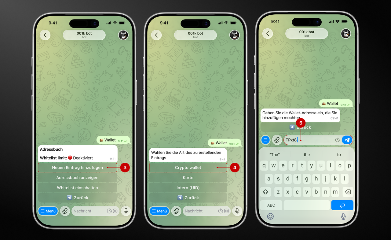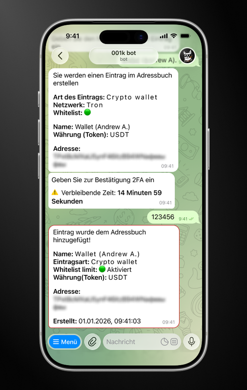Das Adressbuch in 001kBOT spart Ihnen Zeit und vereinfacht das Senden von Geldern an bereits gespeicherte „Kontakte". Sie müssen Ihre Daten nicht mehr bei jeder Transaktion eingeben – fügen Sie einfach Einträge in das Adressbuch hinzu und senden Sie Zahlungen mit wenigen Klicks.