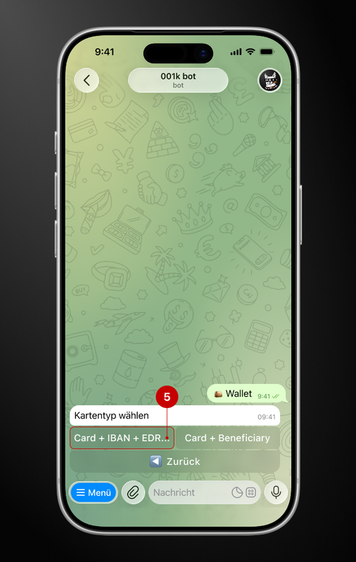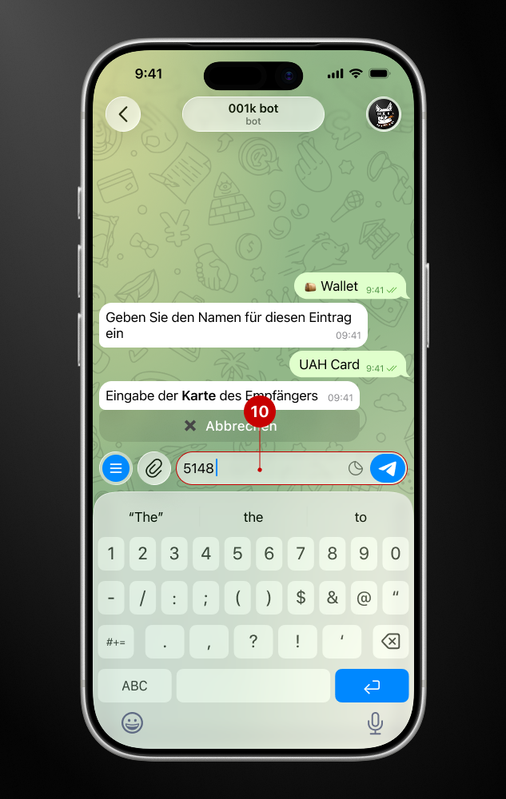 In diesem Schritt benötigen Sie außerdem: den vollständigen Namen, die IBAN und die EDRPOU/INP-Nummer des Karteninhabers. Die Daten werden schrittweise abgefragt. Befolgen Sie die Anweisungen des Bots und überprüfen Sie die eingegebenen Informationen sorgfältig.