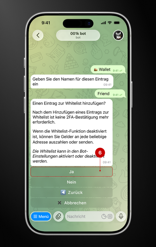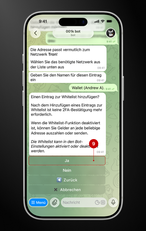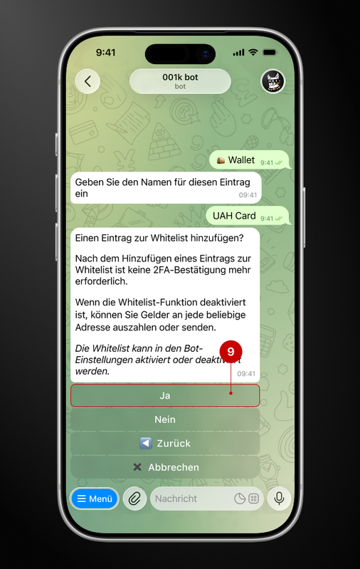 An diesem Punkt fordert der Bot Ihre Zustimmung zur Einfügung der Adresse in seine Whitelist ein. In diesem Beispiel wollen wir den Eintrag zur Whitelist hinzufügen; daher klicken Sie auf die Schaltfläche „Ja“ (9).